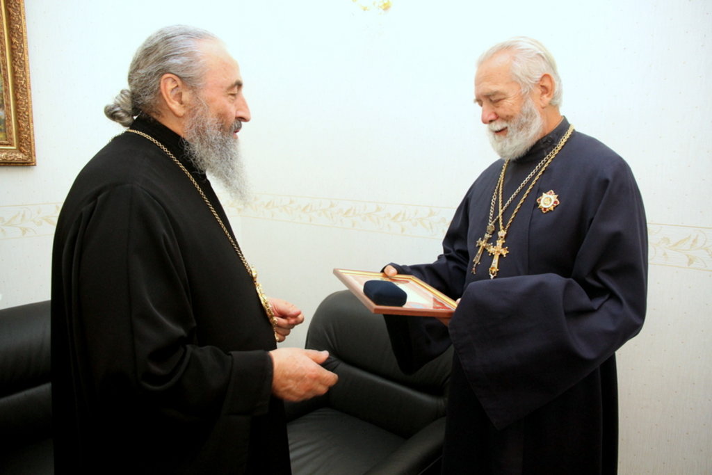 КИЇВ. Блаженніший Митрополит Онуфрій нагородив орденом УПЦ одного з найстаріших кліриків Київської єпархії » 26 жовтня на території Свято-Успенської Києво-Печерської Лаври Предстоятель Української Православної Церкви, Блаженніший Митрополит Київський і всієї України Онуфрій зустрівся із почесним настоятелем храм Покрови Божої Матері на Пріорці протоієреєм Борисом Удовернком. У зустрічі також взяв участь секретар Київської єпархії протоієрей Костянтин Пилипчук