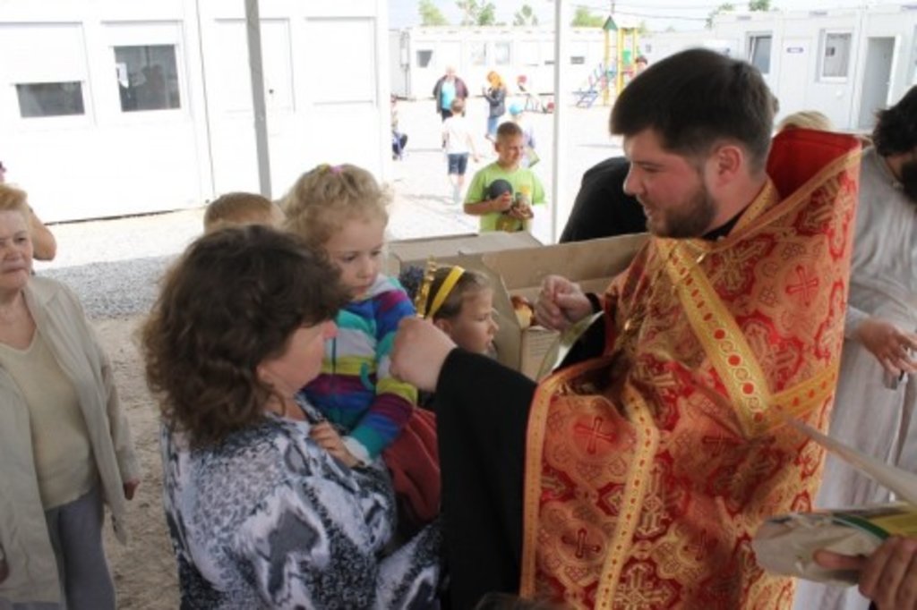 Священики Борисполя, Запоріжжя та Одеси передали у місця компактного проживання переселенців подарунки до Пасхи » Клірики Покровського архієрейського собору протоієрей Костянтин Максимов та ієрей Олексій Саливон-Гончаренко спільно з активом православної молоді Запоріжжя відвідали місцеве містечко переселенців із зони АТО, щоб привітати людей, які тут живуть, зі святом Світлого Христового Воскресіння