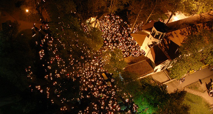 Символизируя переход от мрака язычества к свету христианства, живописно оттеняя свет Воскресения Христова, крестный ход начинается в темном храме, освещенном лишь горящими в руках людей свечами.