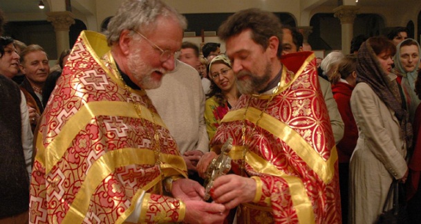 Если в храме только один священник, то иконы Воскресения Христова и Евангелие несут миряне, прикрыв руки платками из благоговения к святыне.