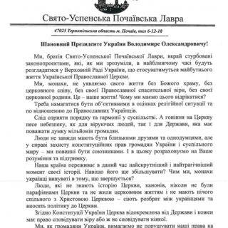 У даному зверненні братія Почаївської лаври висловила стурбованість підготовкою даних законопроектів та нагадала, що Українська Православна Церква – це найбільше релігійне об’єднання в Україні, яке в умовах війни надає потужну гуманітарну підтримку Захисникам України та людям, які постраждали від воєнних дій.
