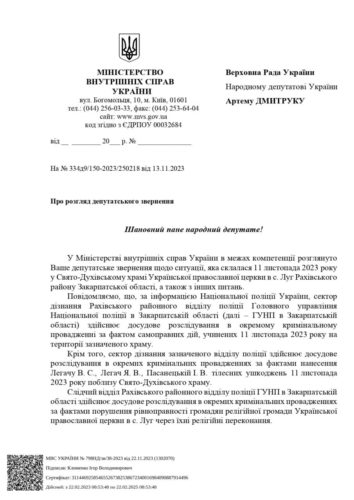 «Нагадаю, що під час рейдерського захоплення храму люди у військовій формі застосували силу проти вагітної жінки, віруючих та священика УПЦ! Більше того, за інформацією місцевих мешканців, правоохоронці всіляко сприяли бандитам безперешкодно захоплювати святиню. Мною, як народним депутатом України, було направлено звернення очільнику МВС Ігорю Клименку», — написав народний депутат.