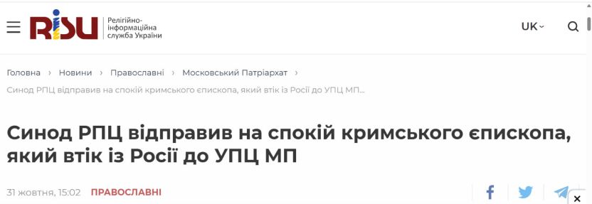 У новині зазначається, що єпископ Агафон, який до початку повномасштабного вторгнення РФ в Україну ніс своє служіння у Криму, “залишив територію Росії”. Таким чином РІСУ стверджує, що Крим начебто є російською територію.