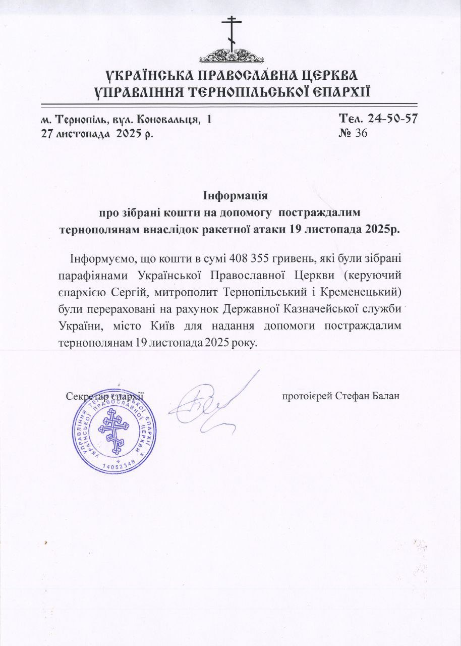 Тернопільська єпархія передала понад 400 тисяч гривень постраждалим від обстрілу РФ жителям міста »