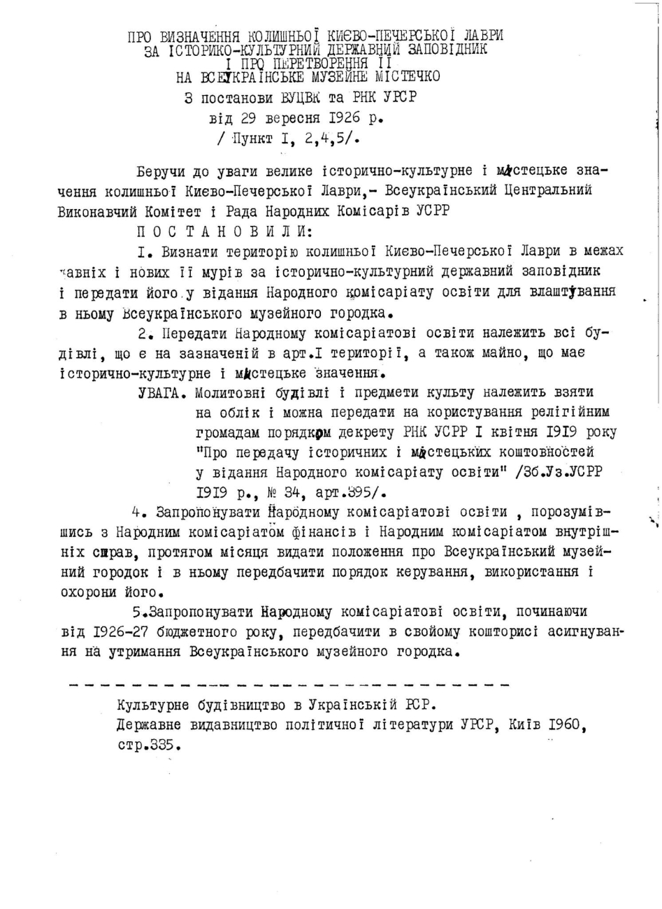 В Києво-Печерській обителі описують цей період так: «Після жовтневого перевороту для Лаври почалися найважчі в її історії часи. Згідно з Декретом радянського уряду «Про відділення Церкви від держави і школи від Церкви» все майно церковних і релігійних товариств було оголошено надбанням народу. 29 вересня 1926 року ВУЦВК і Рада народних Комісарів УРСР прийняли постанову про «Визнання колишньої Києво-Печерської Лаври історико-культурним державним заповідником і про перетворення її на Всеукраїнське музейне містечко».